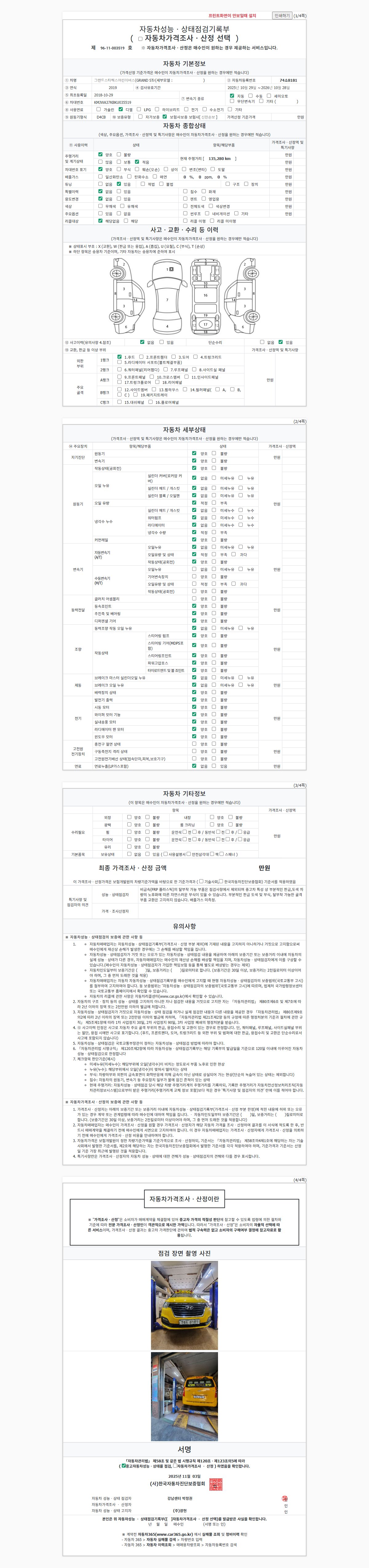 | 주행거리 | 135,277 km | 차량번호 | 74소8181 | 사고유무 | 성능기록부 참조 | 제시번호 | 제 2025146728 호 |