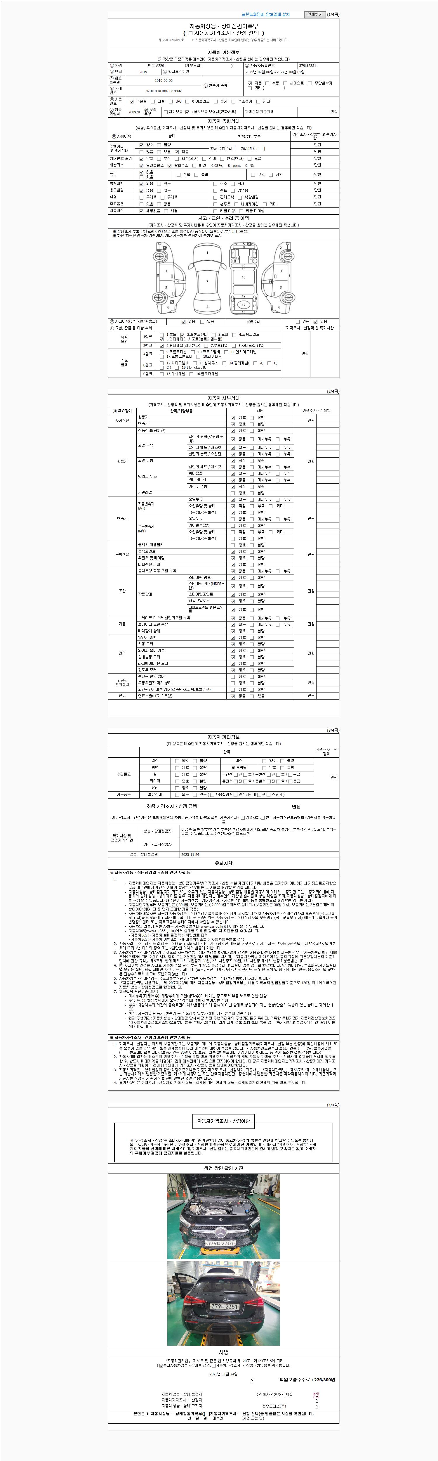 | 주행거리 | 76,115 km | 차량번호 | 379더2351 | 사고유무 | 성능기록부 참조 | 제시번호 | 제 2025064288 호 |