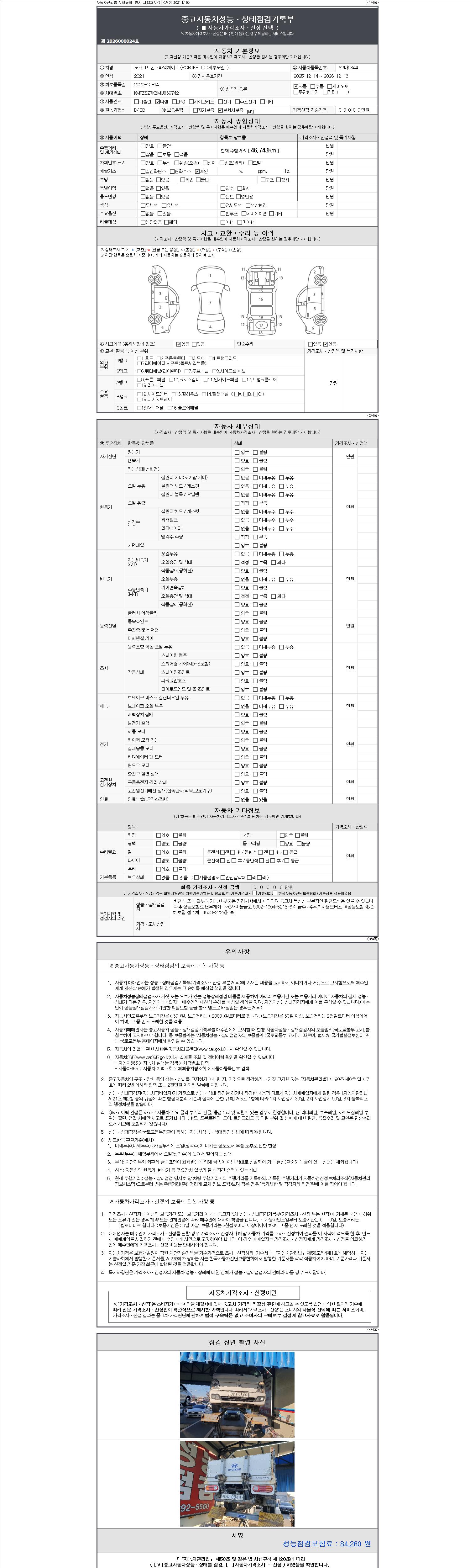 | 주행거리 | 46,743 km | 차량번호 | 82나0844 | 사고유무 | 성능기록부 참조 | 제시번호 | 제 2147483647 호 |