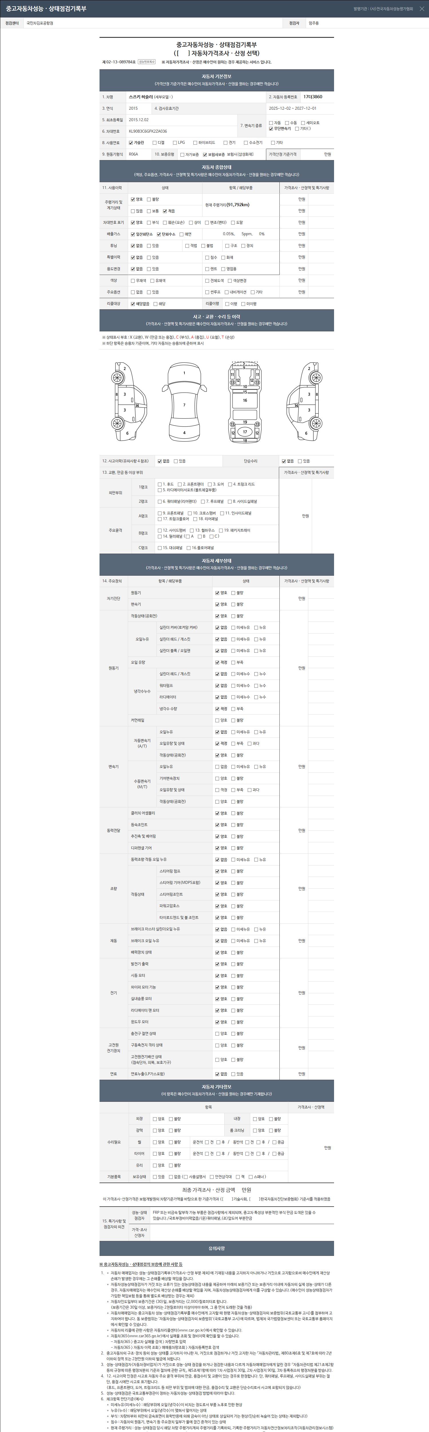 | 주행거리 | 91,793 km | 차량번호 | 17더3860 | 사고유무 | 성능기록부 참조 | 제시번호 | 제 2026004685 호 |