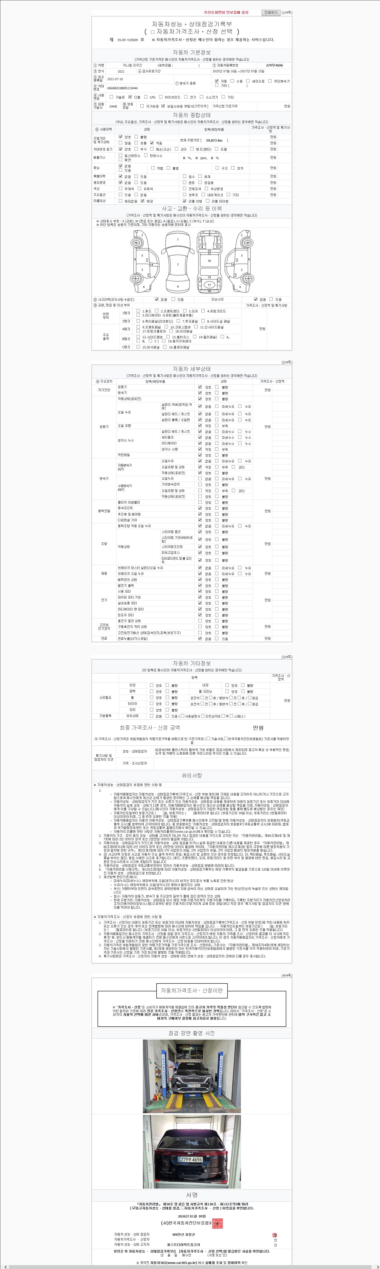 | 주행거리 | 59,873 km | 차량번호 | 279무4696 | 사고유무 | 성능기록부 참조 | 제시번호 | 제 2147483647 호 |