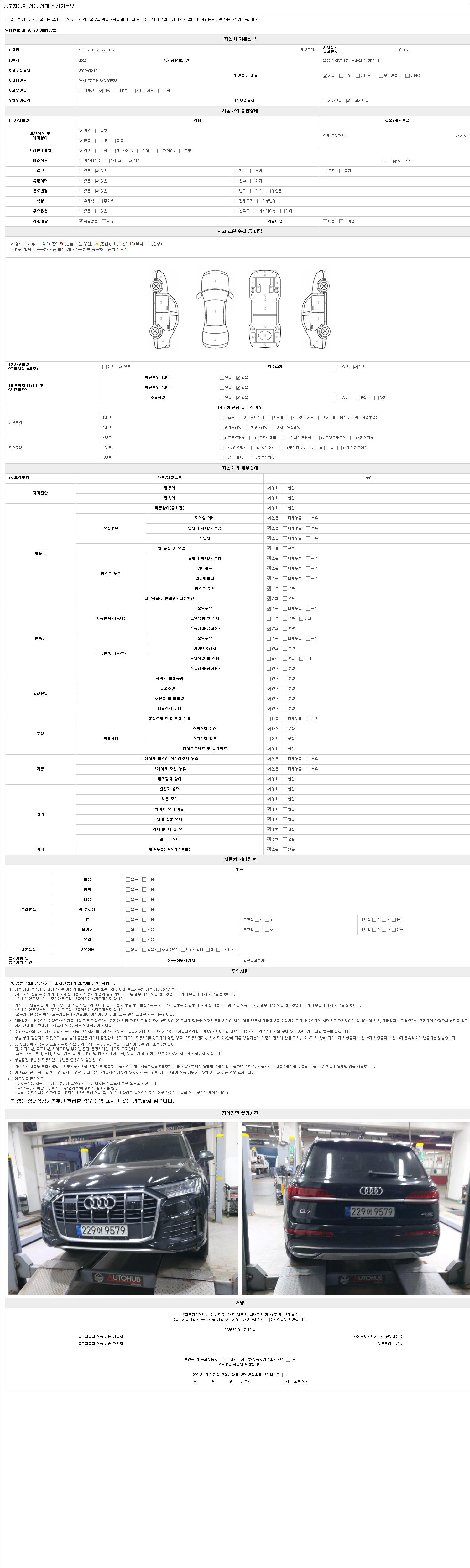 - 2. 차량 등록증이나 성능점검지 등을 상담자에게 요청및 확인하시고 사전에 미리 점검 하시기를 권유드립니다.