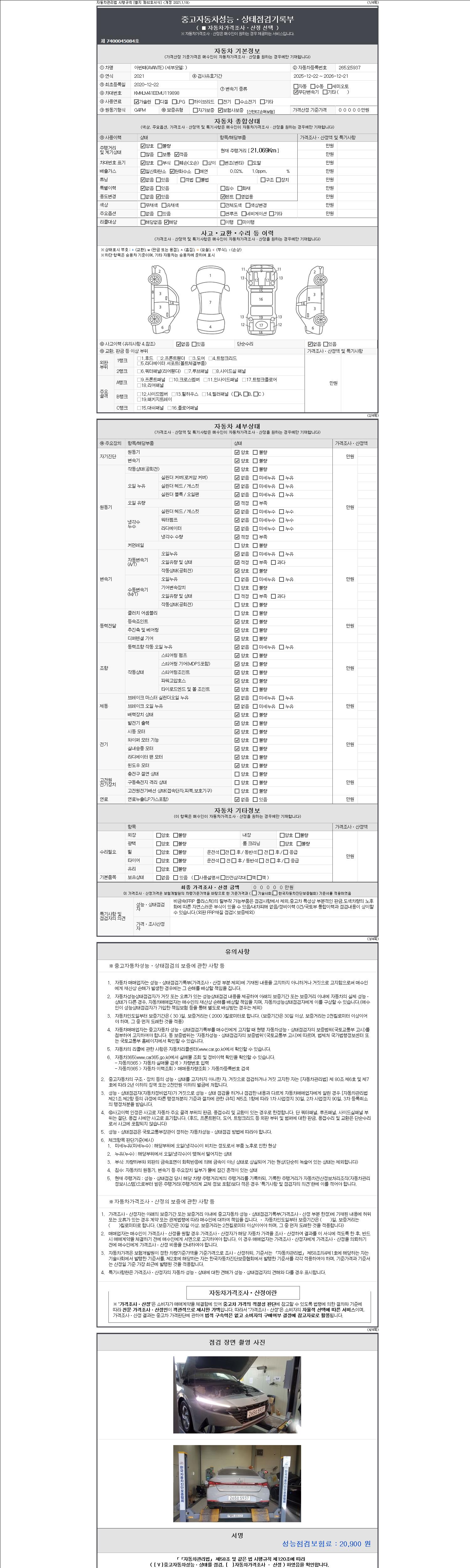| 주행거리 | 21,069 km | 차량번호 | 265오5937 | 사고유무 | 성능기록부 참조 | 제시번호 | 제 2147483647 호 |