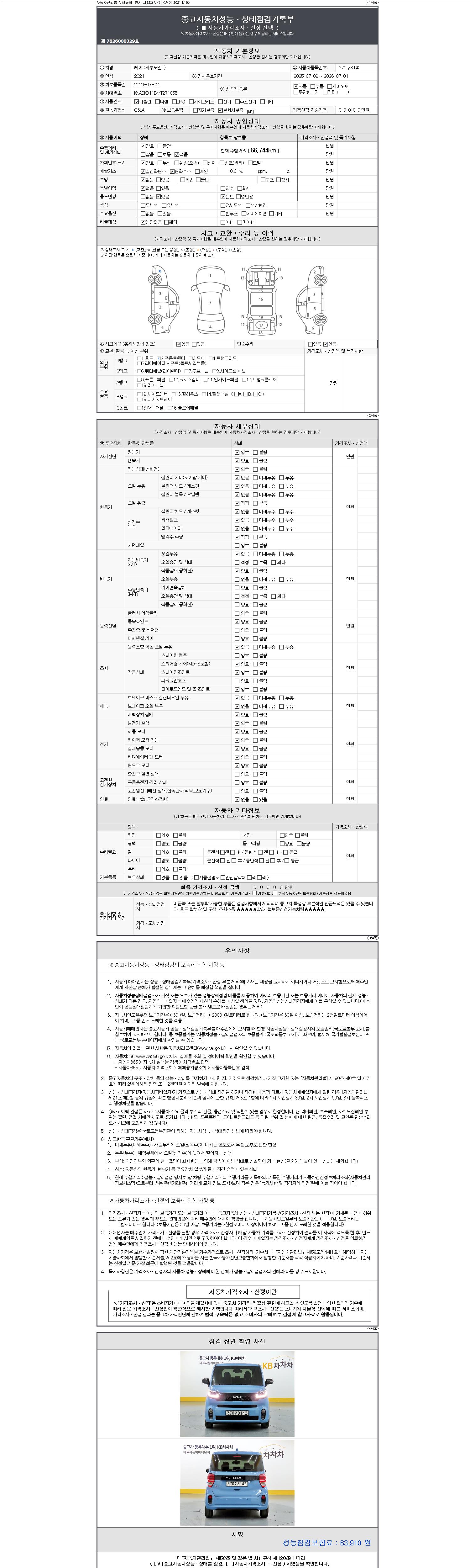 | 주행거리 | 66,744 km | 차량번호 | 370구8142 | 사고유무 | 성능기록부 참조 | 제시번호 | 제 2147483647 호 |