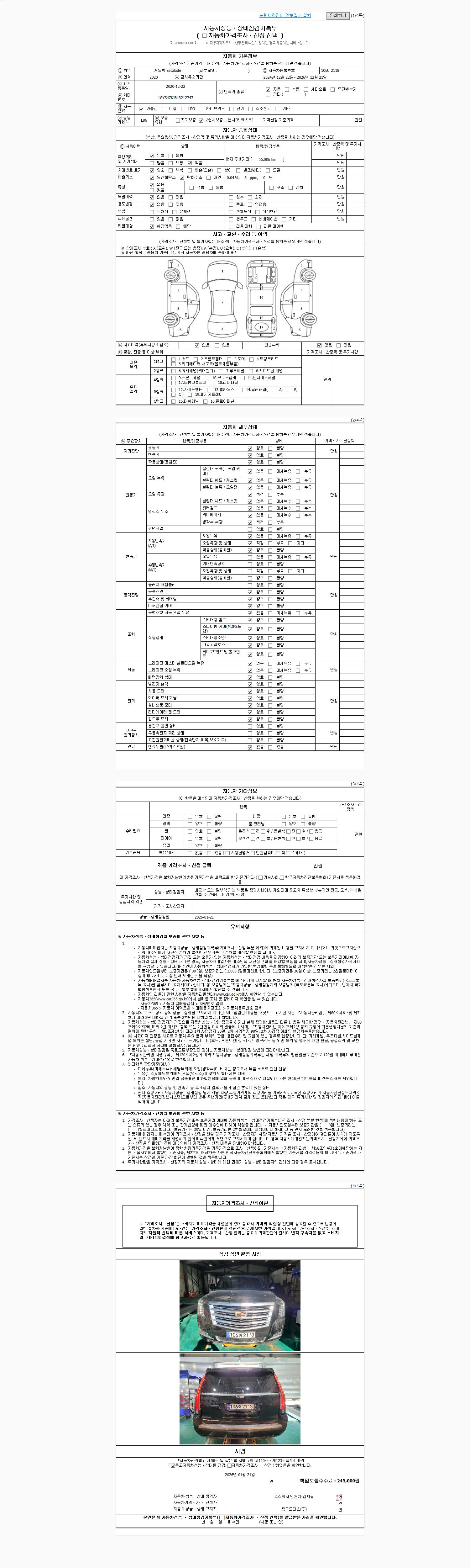 | 주행거리 | 56,006 km | 차량번호 | 106어2118 | 사고유무 | 성능기록부 참조 | 제시번호 | 제 2026003717 호 |