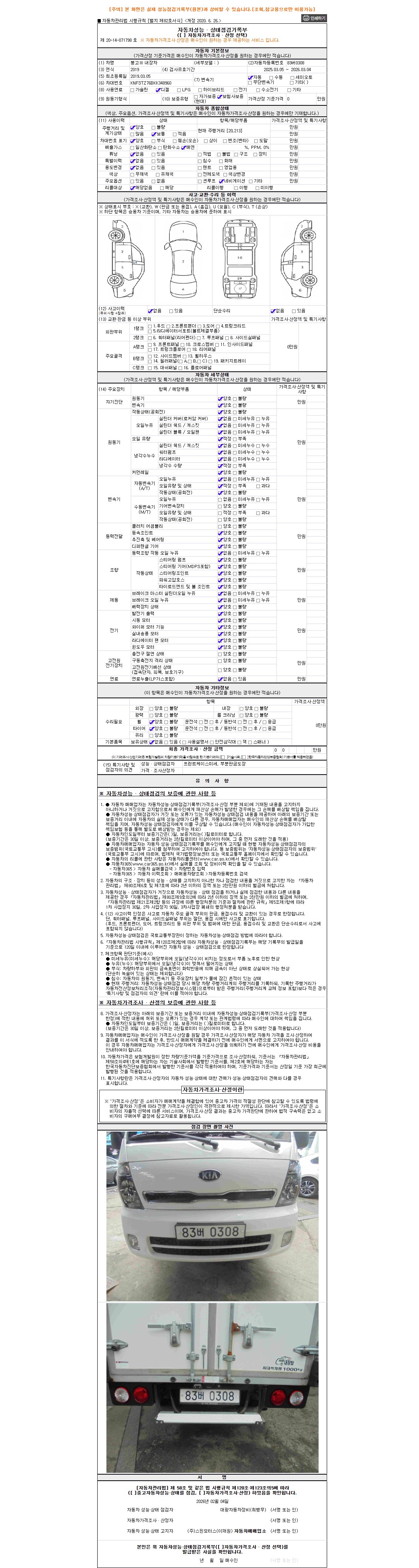 | 주행거리 | 20,207 km | 차량번호 | 83버0308 | 사고유무 | 성능기록부 참조 | 제시번호 | 제 2026014973 호 |