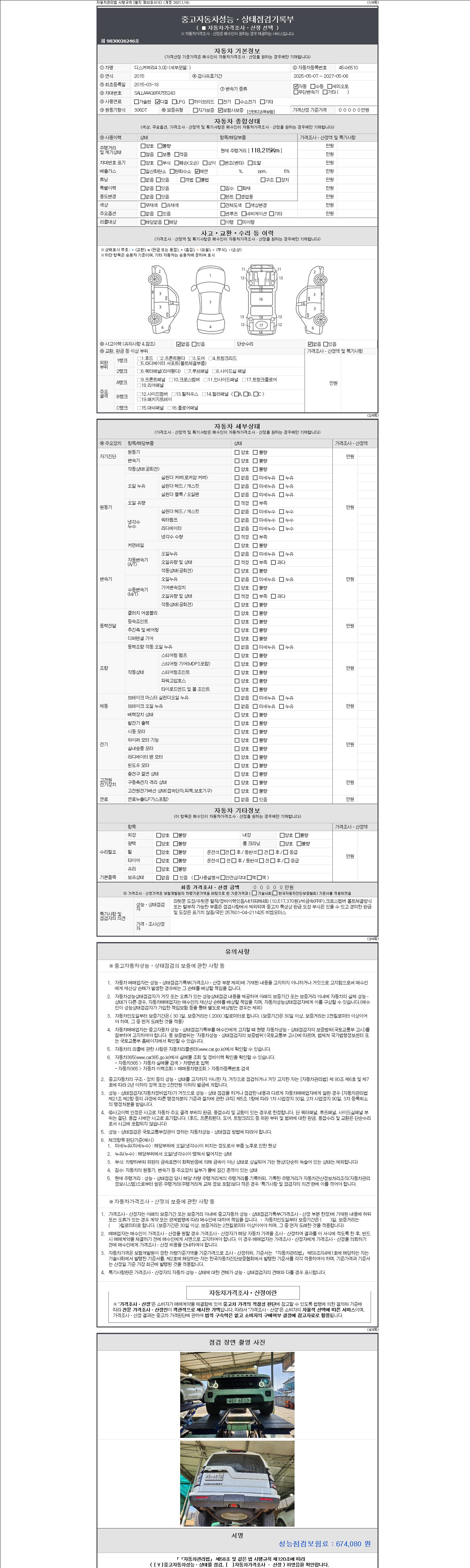 | 주행거리 | 118,215 km | 차량번호 | 45수6510 | 사고유무 | 성능기록부 참조 | 제시번호 | 제 2147483647 호 |