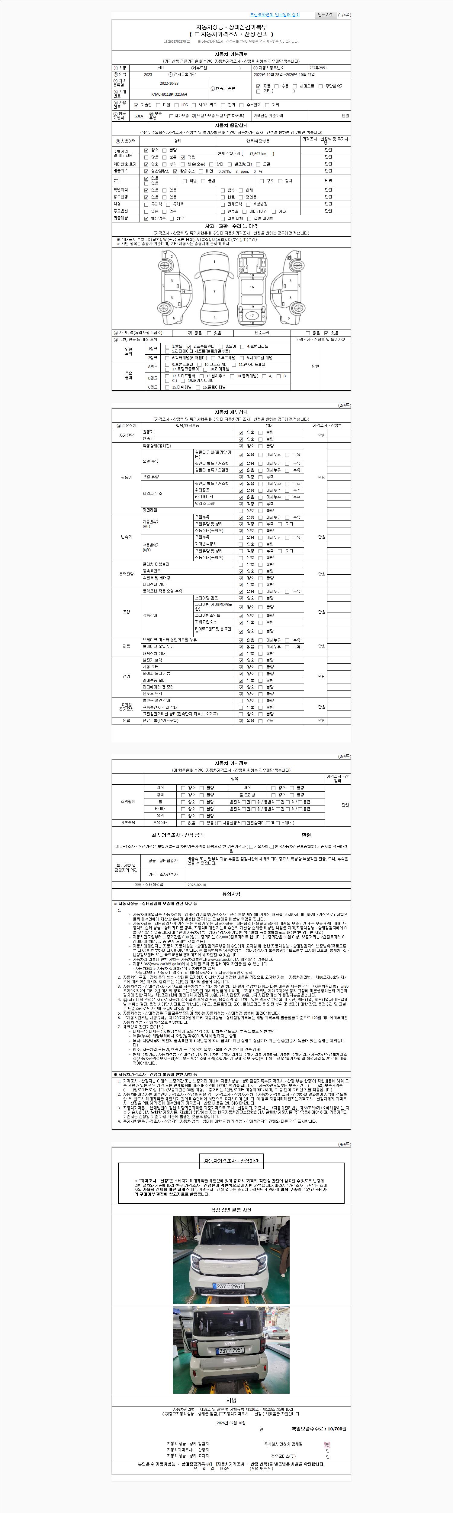 | 주행거리 | 17,697 km | 차량번호 | 237무2951 | 사고유무 | 성능기록부 참조 | 제시번호 | 제 2026007512 호 |