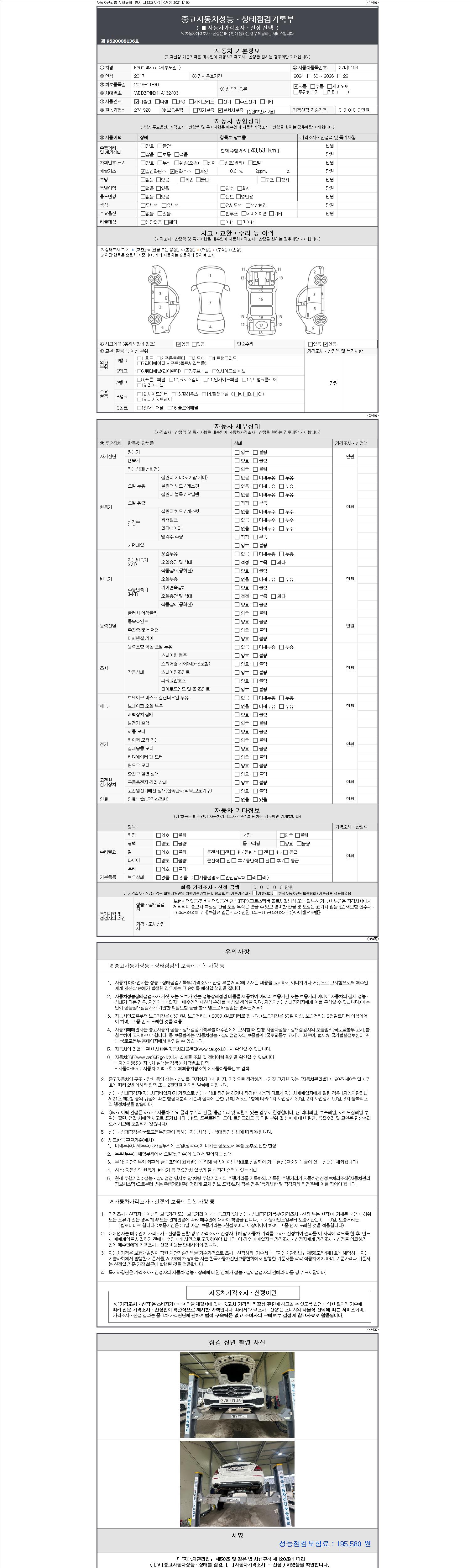 | 주행거리 | 43,531 km | 차량번호 | 27버0106 | 사고유무 | 성능기록부 참조 | 제시번호 | 제 2147483647 호 |