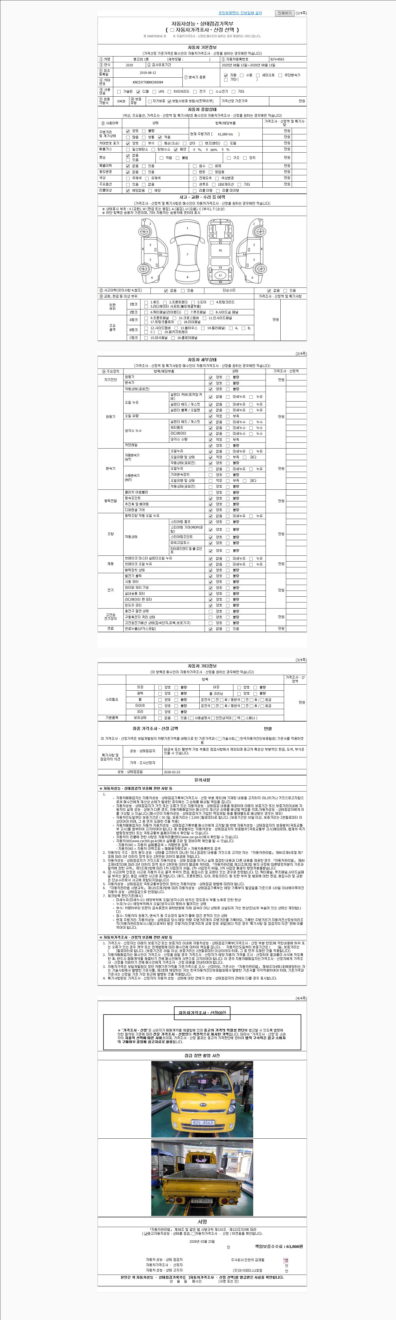 | 주행거리 | 61,689 km | 차량번호 | 82누4563 | 사고유무 | 성능기록부 참조 | 제시번호 | 제 2026009108 호 |