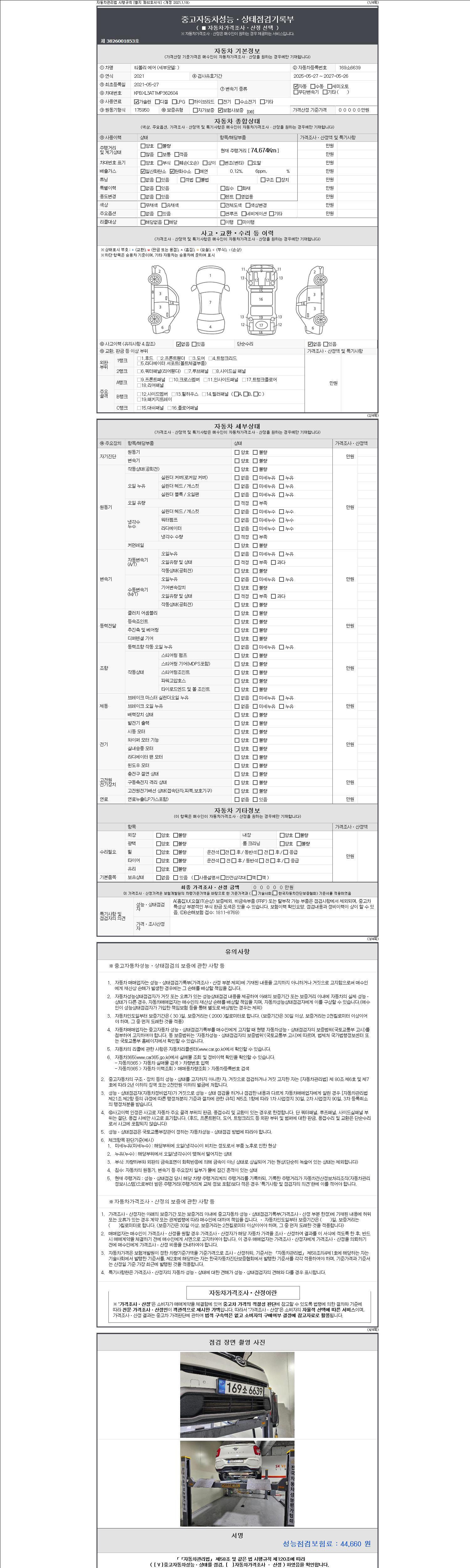 | 주행거리 | 74,674 km | 차량번호 | 169소6639 | 사고유무 | 성능기록부 참조 | 제시번호 | 제 2147483647 호 |