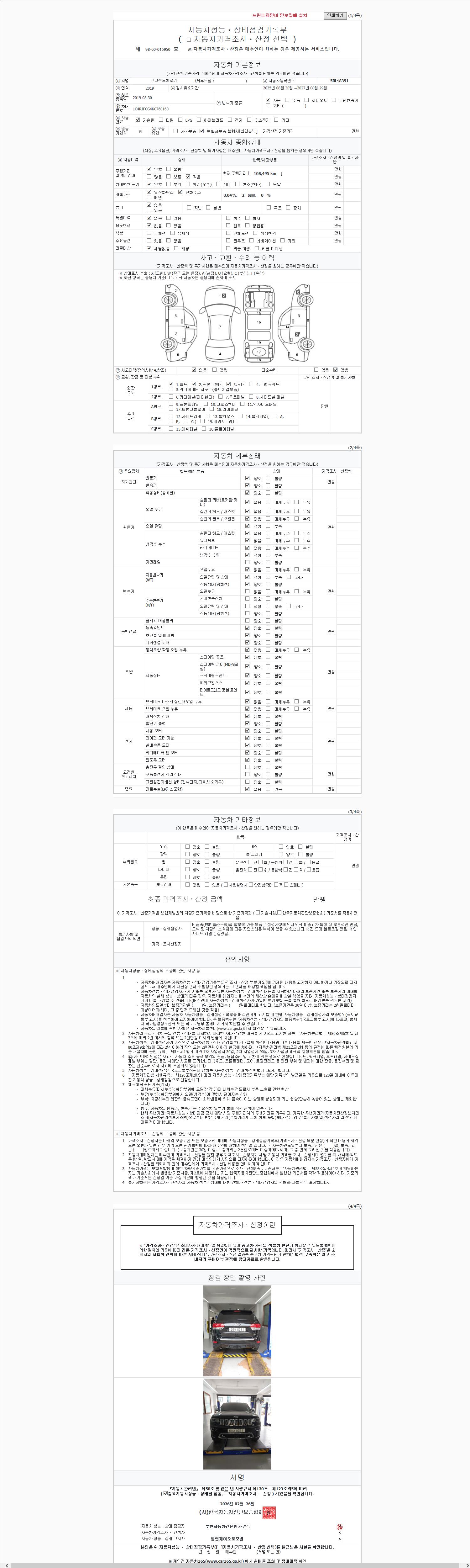 | 주행거리 | 108,495 km | 차량번호 | 50너8391 | 사고유무 | 성능기록부 참조 | 제시번호 | 제 2026036051 호 |