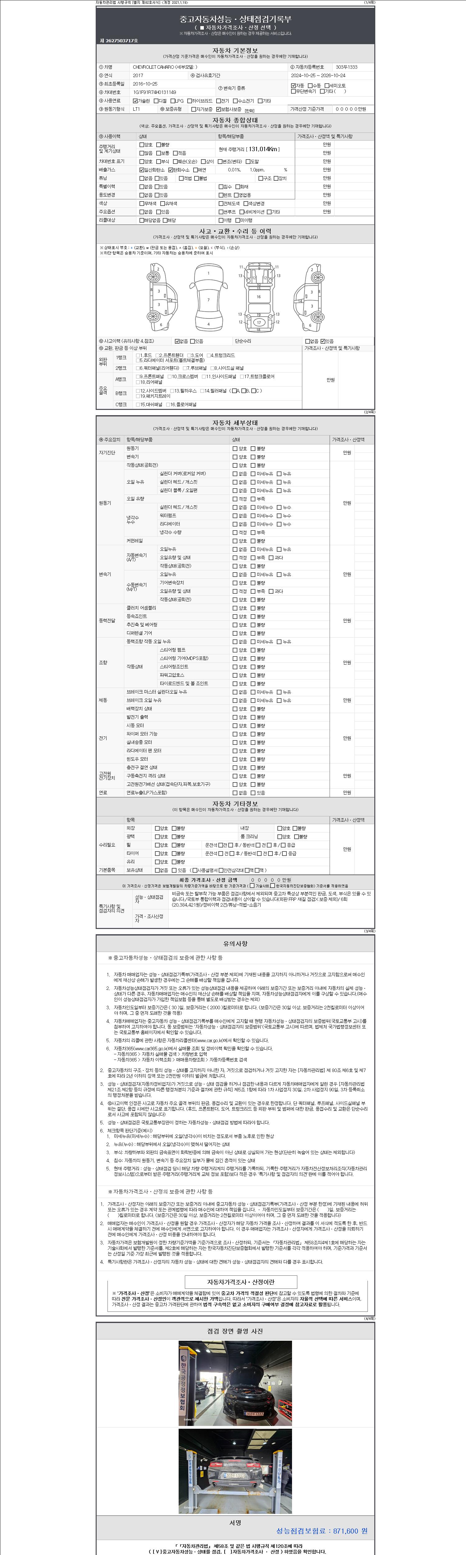 | 주행거리 | 131,014 km | 차량번호 | 303두1333 | 사고유무 | 성능기록부 참조 | 제시번호 | 제 2147483647 호 |