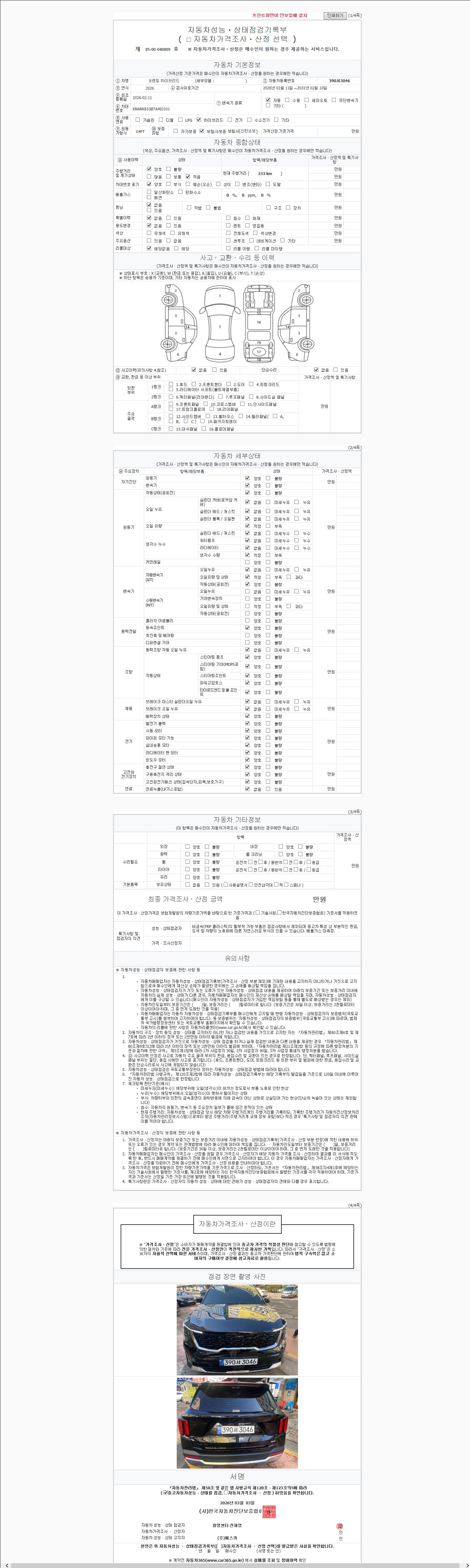 | 주행거리 | 231 km | 차량번호 | 390서3046 | 사고유무 | 성능기록부 참조 | 제시번호 | 제 2147483647 호 |