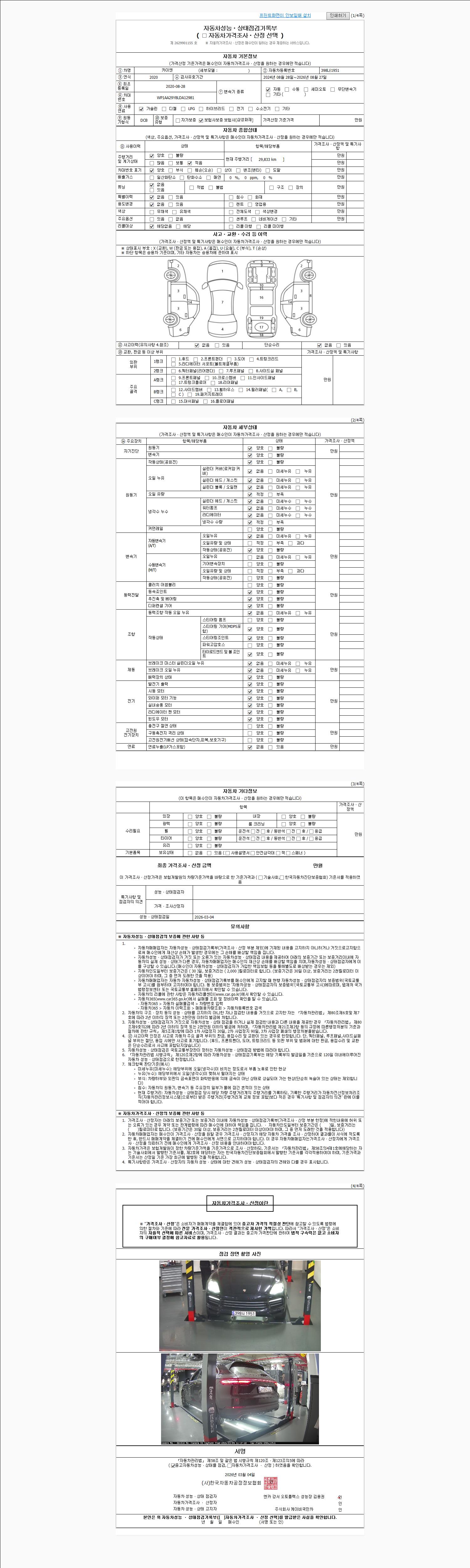 | 주행거리 | 29,833 km | 차량번호 | 398너1951 | 사고유무 | 성능기록부 참조 | 제시번호 | 제 2026027572 호 |