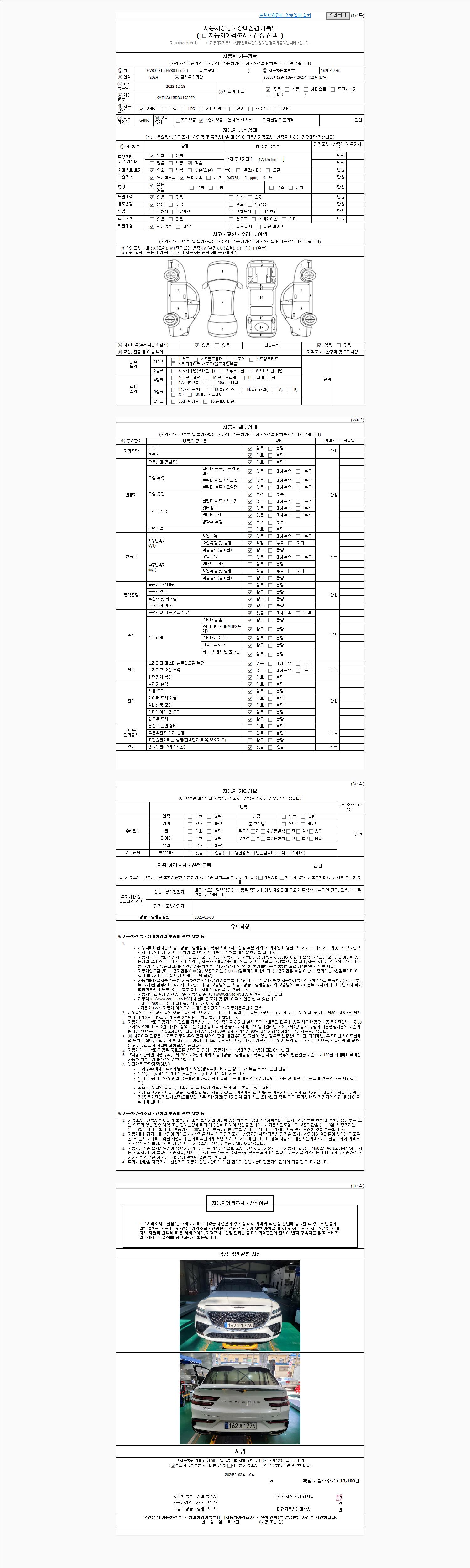 | 주행거리 | 17,476 km | 차량번호 | 162마1776 | 사고유무 | 성능기록부 참조 | 제시번호 | 제 2026012408 호 |