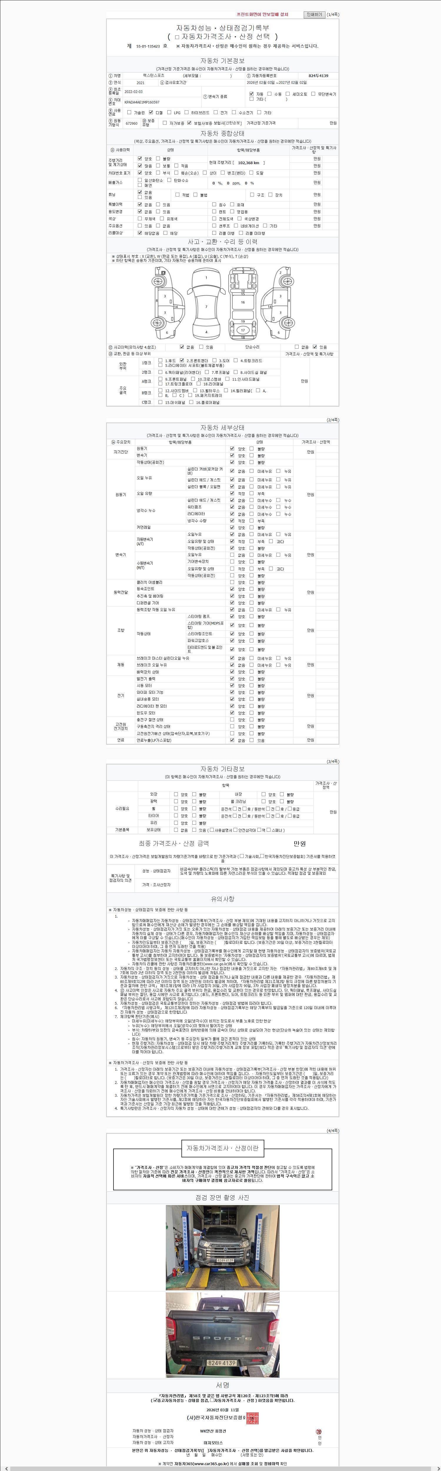 | 주행거리 | 102,368 km | 차량번호 | 824두4139 | 사고유무 | 성능기록부 참조 | 제시번호 | 제 2147483647 호 |