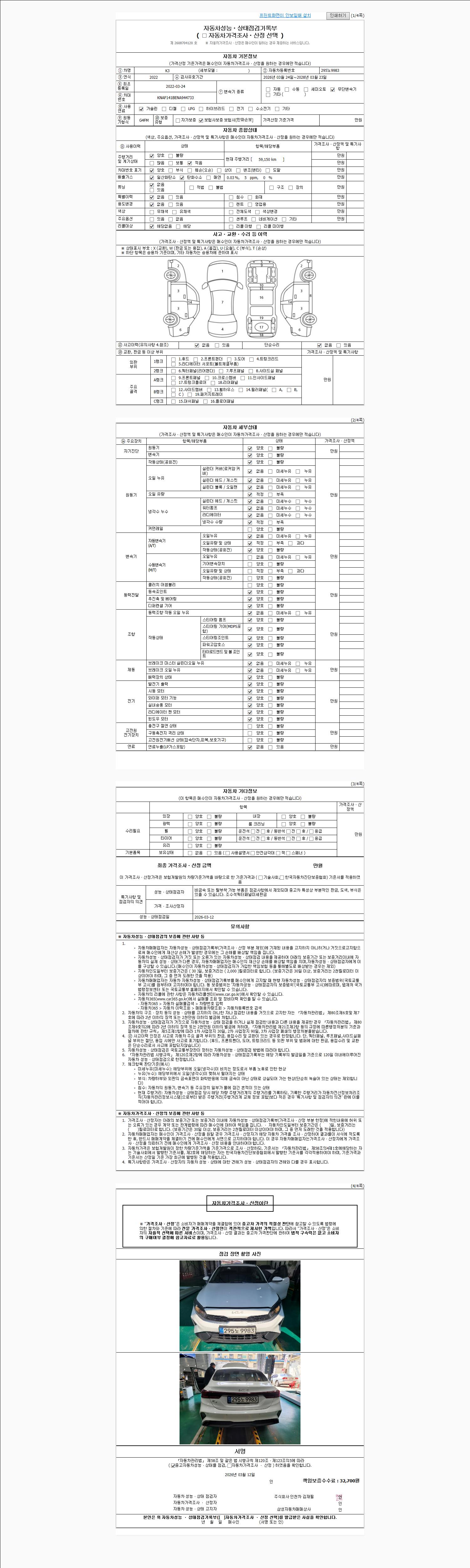 | 주행거리 | 59,100 km | 차량번호 | 295노9983 | 사고유무 | 성능기록부 참조 | 제시번호 | 제 2026012958 호 |