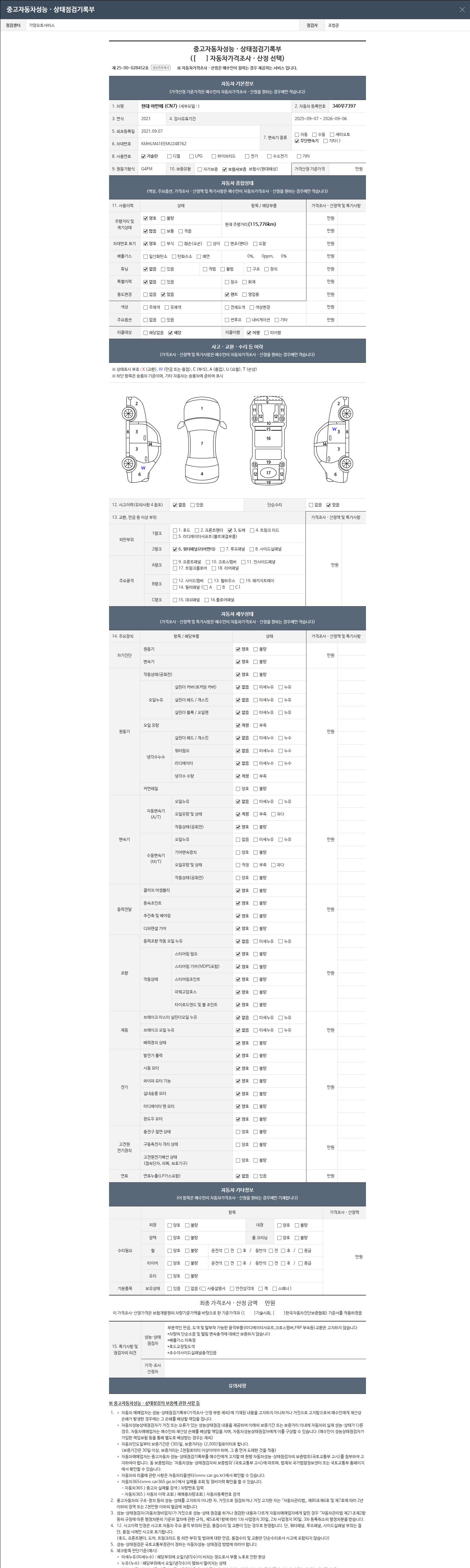 | 주행거리 | 115,776 km | 차량번호 | 340무7397 | 사고유무 | 성능기록부 참조 | 제시번호 | 제 2026013443 호 |