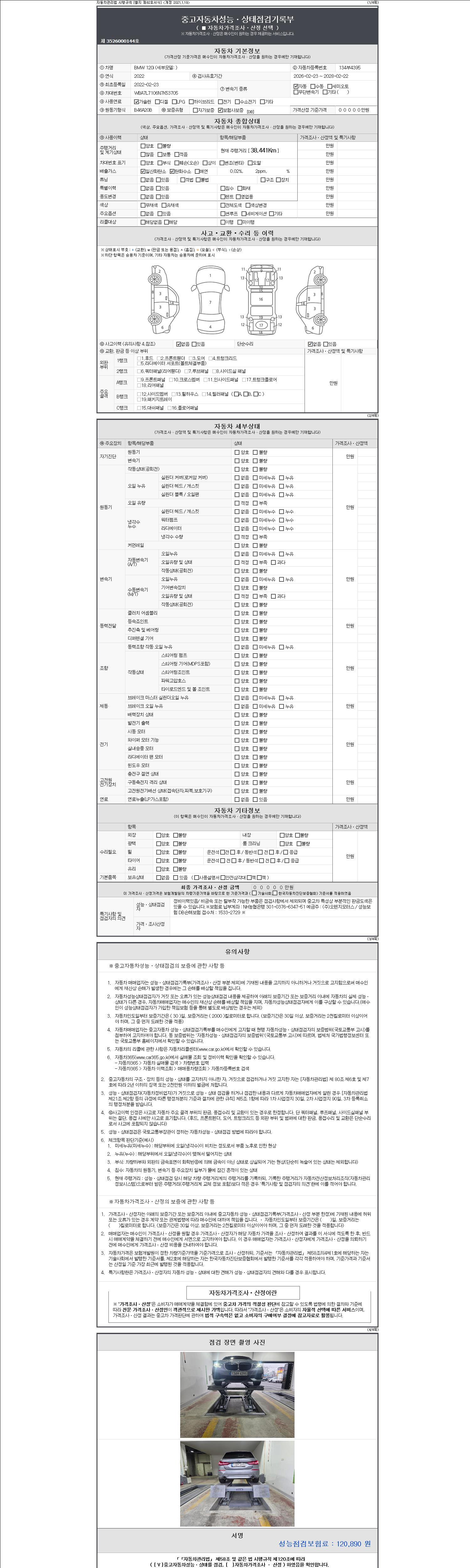 자동차관리법 시행규칙 제120조의 규정에 따라 별지 제 82호서식 《중고자동차 성능, 상태점검 기록부》를 발행한 성능, 상태점검자 및 매매자는 아래의 보증기간 또는 보증거리 이내의 중고자동차, 성능점검 기록부에 기재된 내용과 자동차의 실제 성능, 상태가 다른 경우 계약 또는 관계법령에 따라 매수인에 대하여 책임을 집니다.