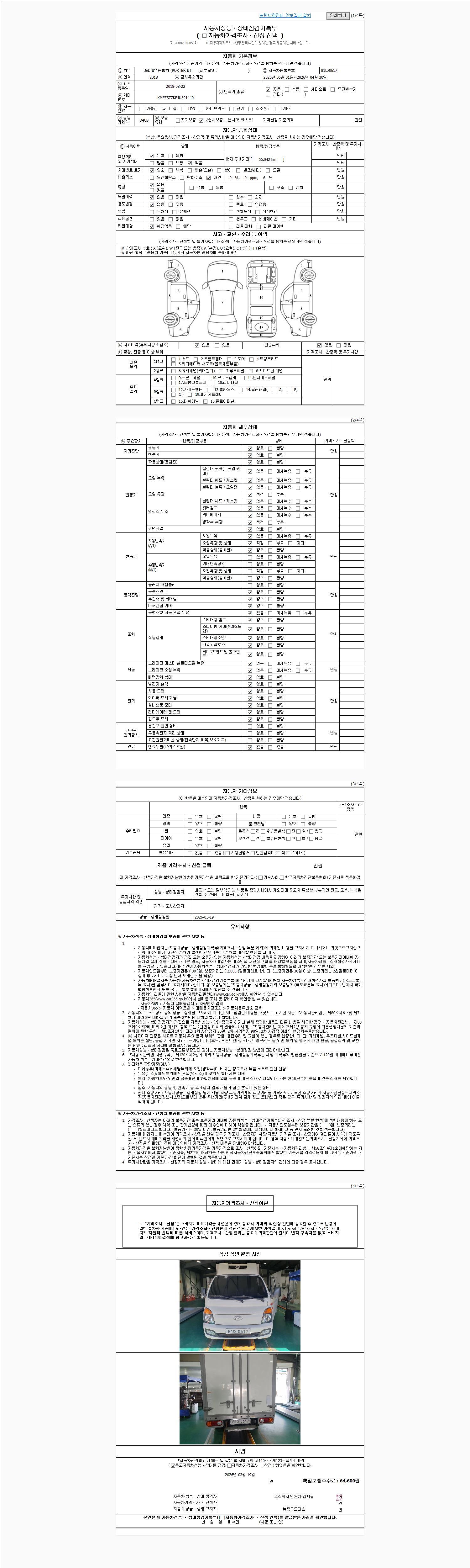 | 주행거리 | 66,042 km | 차량번호 | 81다0617 | 사고유무 | 성능기록부 참조 | 제시번호 | 제 2026014417 호 |