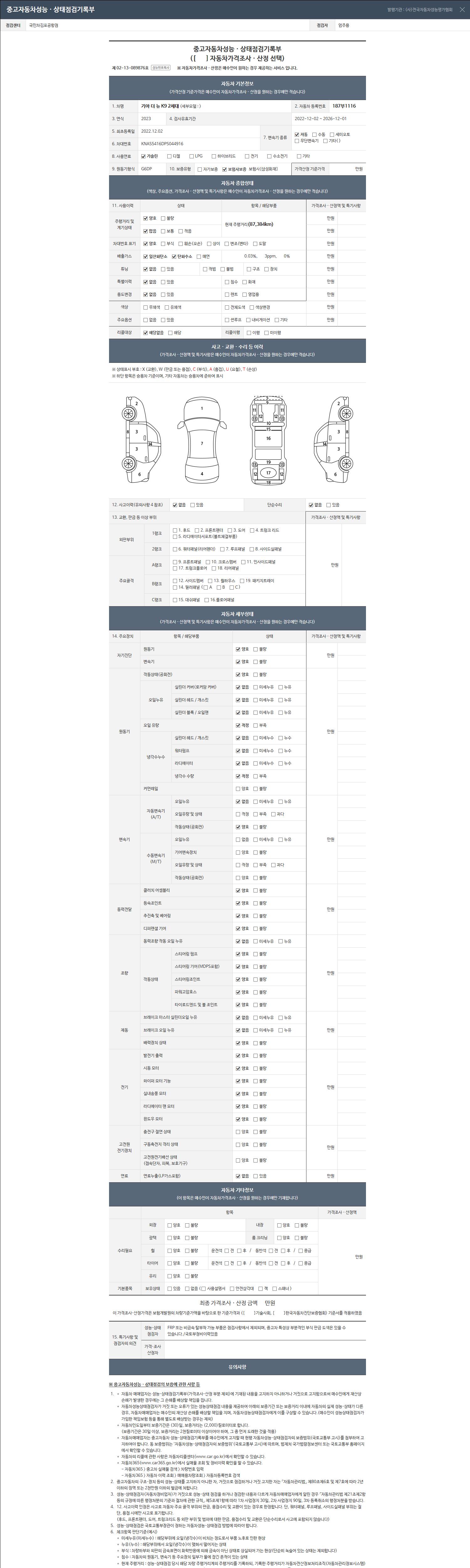 | 주행거리 | 87,361 km | 차량번호 | 187부1116 | 사고유무 | 성능기록부 참조 | 제시번호 | 제 2026006744 호 |