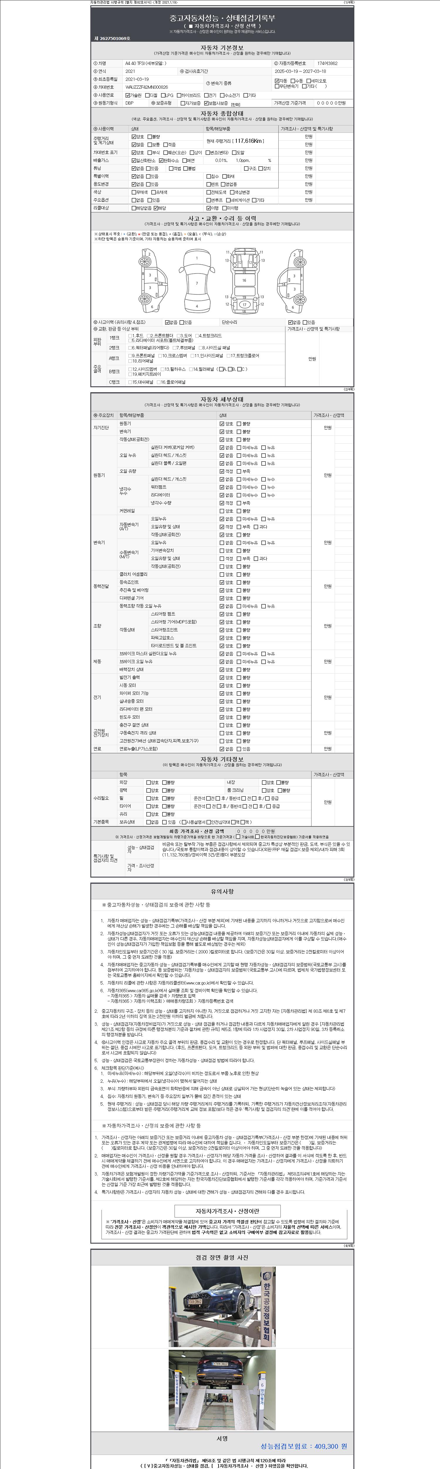 자동차관리법 시행규칙 제120조의 규정에 따라 별지 제 82호서식 《중고자동차 성능, 상태점검 기록부》를 발행한 성능, 상태점검자 및 매매자는 아래의 보증기간 또는 보증거리 이내의 중고자동차, 성능점검 기록부에 기재된 내용과 자동차의 실제 성능, 상태가 다른 경우 계약 또는 관계법령에 따라 매수인에 대하여 책임을 집니다.