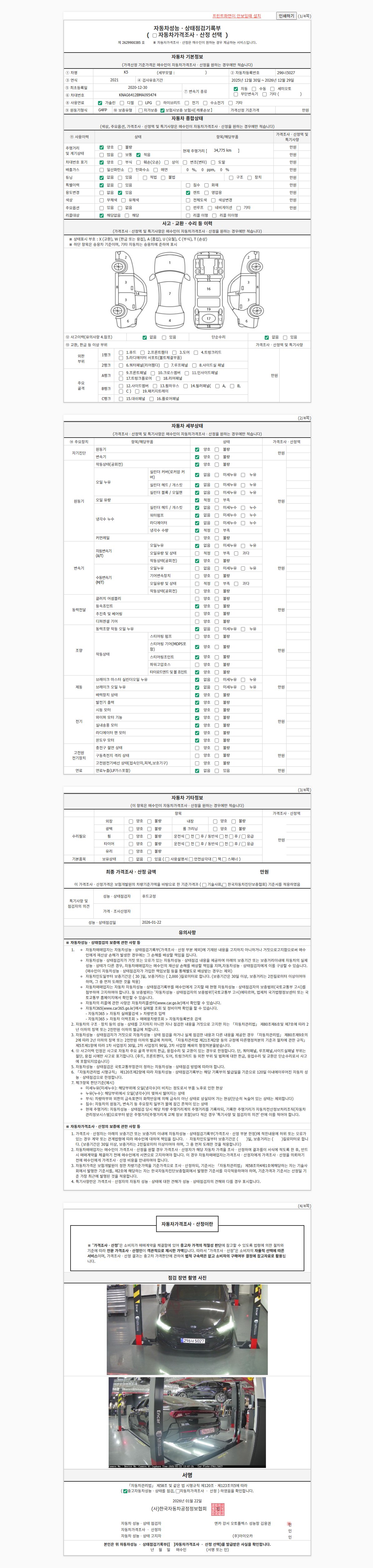 | 주행거리 | 34,775 km | 차량번호 | 296너5027 | 사고유무 | 성능기록부 참조 | 제시번호 | 제 2026008827 호 |