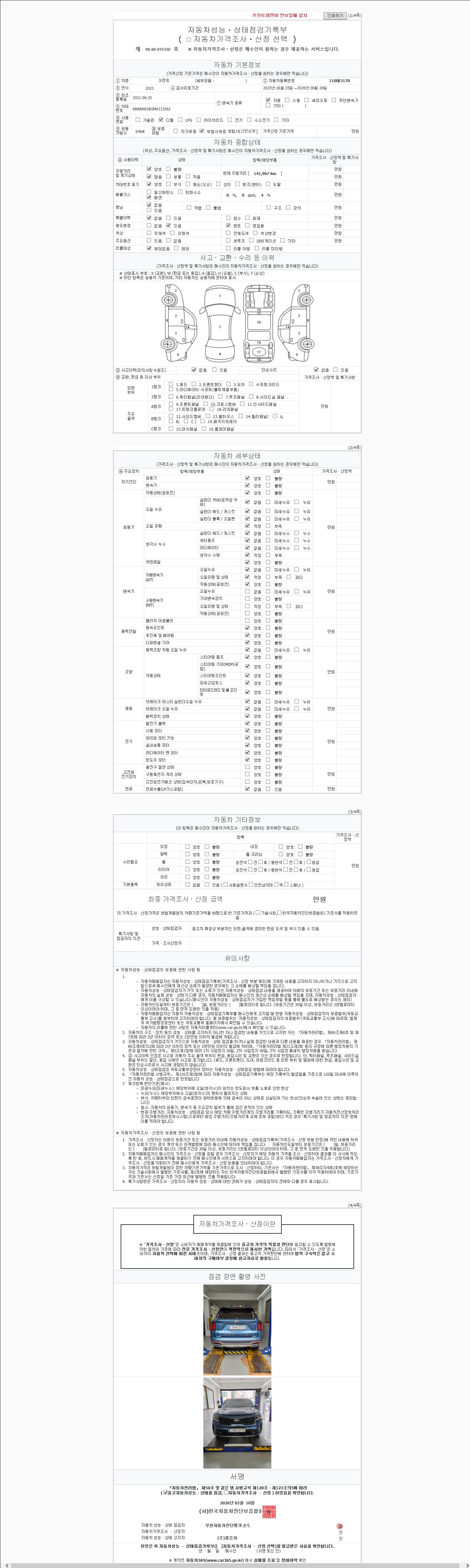 | 주행거리 | 141,960 km | 차량번호 | 110버3170 | 사고유무 | 성능기록부 참조 | 제시번호 | 제 2026025037 호 |