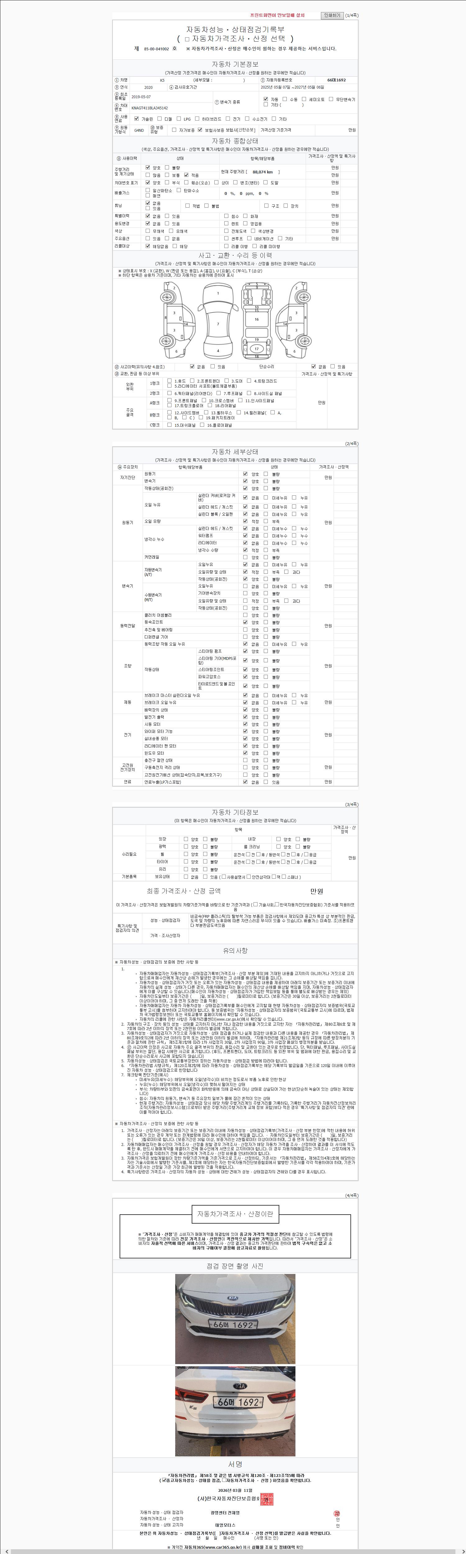 | 주행거리 | 88,074 km | 차량번호 | 66머1692 | 사고유무 | 성능기록부 참조 | 제시번호 | 제 2147483647 호 |