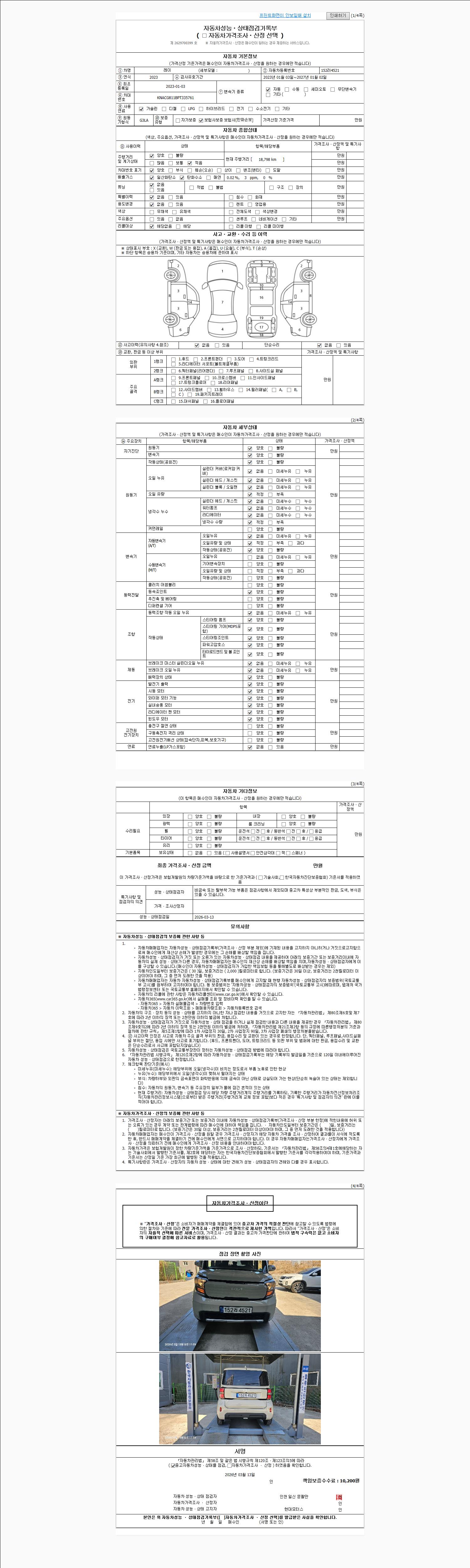 | 주행거리 | 18,900 km | 차량번호 | 152러4521 | 사고유무 | 성능기록부 참조 | 제시번호 | 제 2026013284 호 |