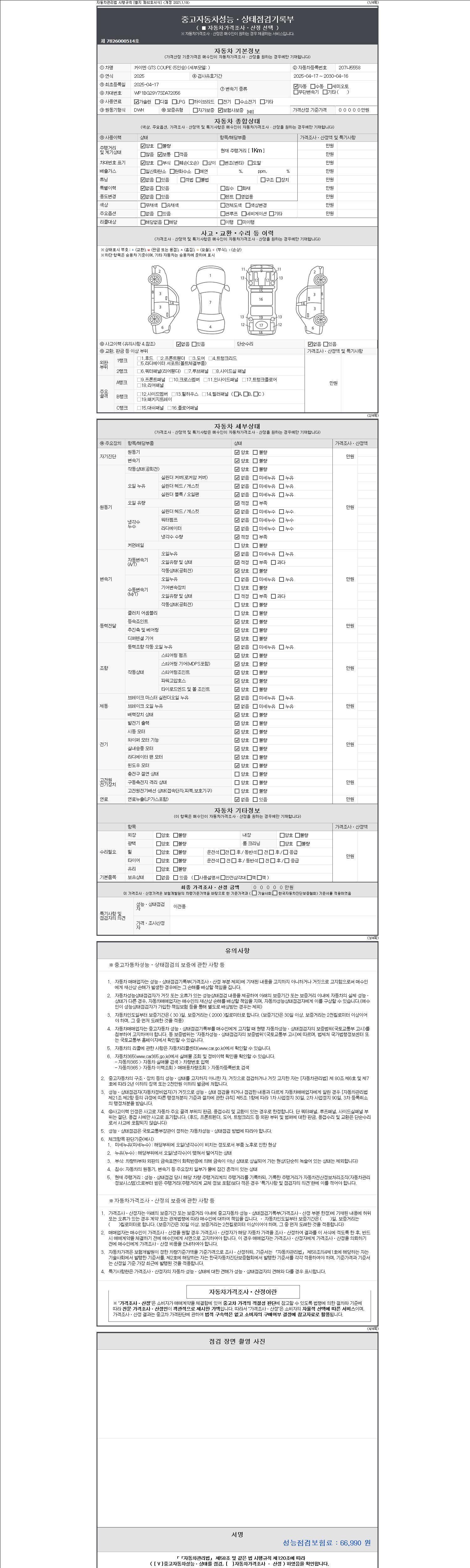 -중고자동차 매매업자를 통해 차량을 구입하실 경우 반드시 "중고자동차 성능, 상태점검 기록부"를 교뷰 받으셔야 하며, 매매업자는 반드시 의무 교부 하여야 압니다.