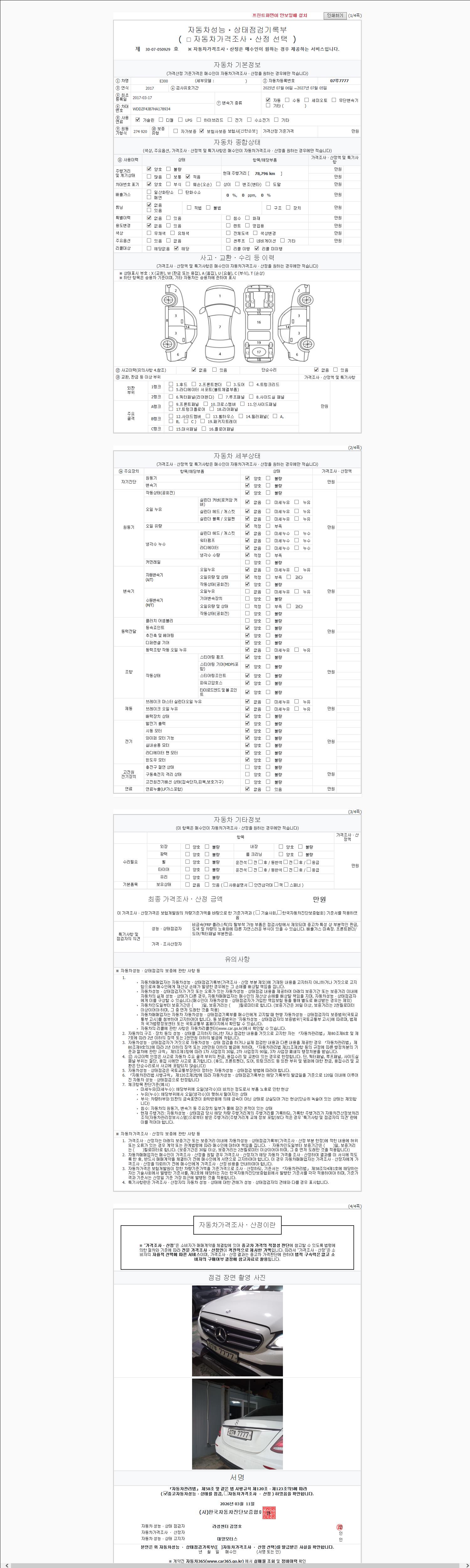 자동차관리법 시행규칙 제120조의 규정에 따라 별지 제 82호서식 《중고자동차 성능, 상태점검 기록부》를 발행한 성능, 상태점검자 및 매매자는 아래의 보증기간 또는 보증거리 이내의 중고자동차, 성능점검 기록부에 기재된 내용과 자동차의 실제 성능, 상태가 다른 경우 계약 또는 관계법령에 따라 매수인에 대하여 책임을 집니다.